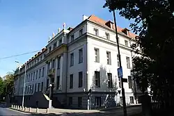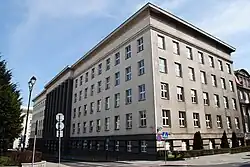 - Gmach dawnego Reichsbanku (ul. Bankowa 5) – z 1911 roku (bądź z lat 1911–1912[14]) według projektu Juliusa Habichta; jest to obiekt wzniesiony na planie prostokąta, na parterze którego pierwotnie ulokowana była sala operacyjna banku; siedmioosiowa fasada jest artykułowana parami pilastrów[37],