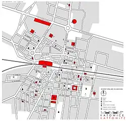 Około 1914 roku Katowice były już miastem o rozwiniętej tkance urbanistycznej, w której znajdowały się publiczne place, urzędy, szkoły, hotele, szpitale, świątynie, obiekty kultury, siedziby firm, kamienice, wille czy domy robotnicze[25]. Historyczne centrum Katowic ukształtowało się w zabudowie, która wypełniła przestrzeń pomiędzy terenami kolejowymi na południu a terenami przemysłowymi na północ od Rawy[2].
