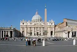 W 1499 do Rzymu przybywa Bramante i buduje niewielką kaplicę – Tempietto na dziedzińcu klasztoru San Pietro in Montorio na Zatybrzu. Zaprojektowana na planie kolistego peripterosu budowla zaowocowała papieskimi zleceniami na rozbudowę watykańskiego pałacu i (w 1505 r.) przebudowę bazyliki św. Piotra. Projekt Bramantego zakładał budowę kościoła rozplanowaną na planie krzyża greckiego z przykryciem pięcioma kopułami – centralną i czterema umieszczonymi pomiędzy ramionami krzyża. Na przedłużeniu osi symetrii poprowadzonych pomiędzy ramionami krzyża Bramante rozmieścił cztery narożne kaplice na planie ośmioboków zwieńczone wieżami. Realizację rozpoczętej budowy przerwała (w 1514 r.) śmierć Bramantego. O kontynuację dzieła zabiegali liczni artyści, z których najbardziej znani to: Rafael Santi, Antonio da Sangallo, Baldassare Peruzzi. Każdy z nich próbował forsować swoje koncepcje zmieniające pierwotny projekt. Dopiero, gdy w 1547 r. zlecenie otrzymał Michał Anioł Buonarroti podjęto prace na większą skalę. Michał Anioł tylko nieco uprościł projekt Bramantego (przede wszystkim zrezygnował z realizacji ośmiobocznych kaplic, skrócił i zwęził ramiona krzyża greckiego). Po wzmocnieniu konstrukcji pod powiększoną centralną kopułą, rozpoczął budowę bębna. Śmierć mistrza tym razem nie przerwała budowy. Kopułę zgodnie z projektem Michała Anioła dokończyli Jacopo Barozzi da Vignola i po nim Giacomo della Porta.