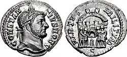 Najczęściej emitowanym typem był argenteus Providentia Augg[ustorum] (lub Victoriae Sarmaticae) z identycznym przedstawieniem na rewersie czterech władców (tetrarchów) składających ofiarę przed bramą obozu wojskowego. Propagandowo akcentowano w ten sposób wspólność rządów i polityczną jedność członków tetrarchii oraz ich ścisły związek z wojskiem i pochodzeniem z szeregów armii. Podobną rolę spełniało wyobrażenie warownej bramy obozu wojskowego (castrum) na półargenteusach z hasłem Virtus Militum (Męstwo żołnierzy [tj. armii]).