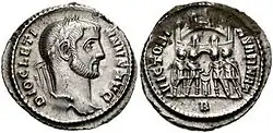 - ↑ Datowanie uznawane obecnie; we wcześniejszych źródłach często inaczej, np.: „Pod koniec 295 r. dodał Dioklecjan do aureusa monetę z czystego srebra” (Cambridge Ancient History, t. XII [1965], s. 338).