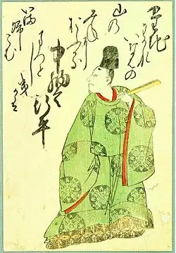 - 1 2 3 4 5 Joshua S. Mostow: Pictures of the Heart: The Hyakunin Isshu in Word and Image. Honolulu: University of Hawaii Press, 1996, s. 190. ISBN 978-0-8248-1705-3. OCLC 756506543. (ang.).