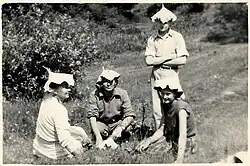 - ↑ Ponadto niektóre inne osoby wymienione na liście szczegółowej sporządzonej przez Armanda Vetulaniego: druga z lewej – Monika Moraczewska, trzeci z lewej – Jerzy Szablowski (historyk sztuki), czwarta z lewej Jadwiga Mączewska (?- pisownia nieczytelna), piąty z lewej – Maciej Masłowski (historyk sztuki), szósty z lewej Stanisław Furmanik (teoretyk literatury i krytyk literacki), siódma z lewej Michalina Chełmońska-Szczepankowska (?), ósmy z lewej "Mirski"? (brak imienia), dziewiąta z lewej Wanda Telakowska artystka sztuk plastycznych, organizatorka polskiego wzornictwa przemysłowego, dziesiąty od lewej Władysław Zawistowski (krytyk) – naczelnik Wydziału Sztuki Ministerstwa Wyznań Religijnych i Oświecenia Publicznego, jedenasty od lewej Jan Alfred Lauterbach historyk sztuki i muzeolog, dwunasty od lewej Tadeusz Mayzner pedagog, kompozytor i dyrygent, a także popularyzator muzyki wśród dzieci i młodzieży , trzynasta od lewej Anna Sosińska ("Kropeczka"), czternasty od lewej Michał Rusinek (pisarz), piętnasta od lewej Hanna Garlińska-Walicka-Zembrzuska (córka Czesława Garlińskiego założyciela znanego salonu sztuki w Warszawie, zamężna m.in. za Michałem Walickim), szesnasta od lewej Halina Balińska-Tabęcka, siedemnasty od lewej Karol Wilhelm Henneberg, osiemnasta od lewej Jadwiga Przeworska, dziewiętnasty od lewej Kazimierz? - lub Stanisław Golachowski, dwudziesty od lewej (pierwszy z prawej) – Michał Gabriel Karski tłumacz i poeta