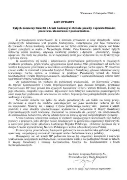 - ↑ List Otwarty Byłych żołnierzy Gwardii i Armii Ludowej w obronie prawdy i sprawiedliwości, przeciwko kłamstwom i pomówieniom, „Głos Kombatanta Armii Ludowej”, 11/12 (180/181), grudzień 2008, s. 1, 2, ISSN 1233-6076.