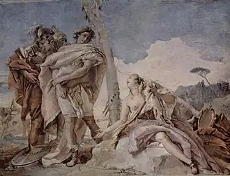 Ubaldo i Duński Rycerz uzbrojeni w różdżkę i czarodziejską tarczę błądzą w poszukiwaniu Rinalda. Pokonują wysłane przeciw nim potwory i w końcu trafiają do czarodziejskiego gaju Armidy. Kiedy jednak Duński Rycerz widzi ukochaną Lucyndę, pobiegnie za nią głuchy na ostrzeżenia Ubalda. Dopiero używając czarodziejskiej różdżki uda mu się odegnać czar. Zaraz jednak sam ulegnie czarowi cudnej Melissy. Teraz z kolei Duński Rycerz pospieszy mu na ratunek, używając tej samej broni[3].