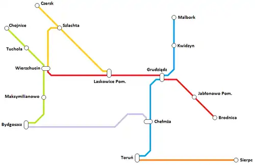 - Brodnica – Jabłonowo Pomorskie – Grudziądz – Bydgoszcz Główna/Laskowice Pomorskie – Wierzchucin – Chojnice[45]