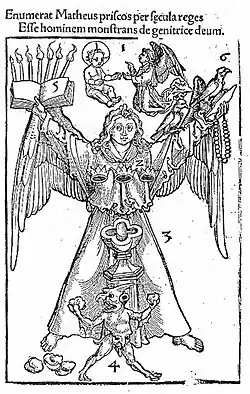 Na pierwszej karcie, odnoszącej się do ewangelii św. Mateusza, znajduje się człowiek ze skrzydłami. Nad nim widoczny jest Chrystus w towarzystwie anioła i cyfra 1. Zestawienie takie oznaczało, iż w pierwszym rozdziale tej ewangelii jest mowa o narodzinach Chrystusa i o ukazaniu się anioła św. Józefowi. Ten sam człowiek na piersi miał znak trzech koron i cyfrę 2, co miało przypominać adeptowi o pokłonie Trzech Króli w drugim rozdziale. Na wysokości brzucha umieszczona została chrzcielnica z cyfrą trzy, nawiązującą do chrztu Jezusa, a pod nią znajdował się diabeł z kamieniami i z cyfrą 4, co nawiązuje do kuszenia Chrystusa na pustkowiu, opisanego w czwartym rozdziale. W prawej dłoni człowieka znajduje się księga z ośmioma lichtarzami i z cyfrą 5. Ten zestaw symboli nawiązuje do kazania Chrystusa i jego ośmiu błogosławieństw. Na wysokości lewej dłoni widoczny jest bochenek chleba, dwa ptaki i cyfra 6, co nawiązuje do przypowieści o ptakach, które nie sieją, a żyją. Piętnaście takich drzeworytów w swojej kompozycji ujmuje treść wszystkich czterech ewangelii.