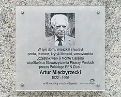 - ↑ Uczcili Międzyrzeckiego: Odsłonięto pamiątkową tablicę. [w:] Gazeta Stołeczna [on-line]. warszawa.wyborcza.pl, 4 grudnia 2012. [dostęp 2021-09-25].