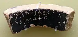 - Uczciwy Arystydes miał na prośbę nieznającego go obywatela-analfabety wpisać swe imię na glinianej skorupce (ostrakon), skazującej go na wygnanie.