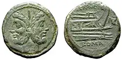 - ↑ Dla propagandowego podkreślenia rosnącej potęgi Rzymu na morzach. Podobnie znaczącą wymowę mógł mieć wizerunek Janusa jako bóstwa kojarzonego z wypowiedzeniem i prowadzeniem wojny (por. Jan Parandowski: Mitologia. Wierzenia i podania Greków i Rzymian [Janus]).