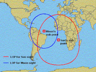 Promień koła pozycyjnego będzie wówczas na mapie odpowiadał linii poprowadzonej z punktu P w kierunku azymutu A. Rysujemy na mapie linię pozycyjną prostopadłą do tego promienia i przechodzącą przez punkt P (odpowiadającą liniowemu przybliżeniu niewielkiego łuku koła pozycyjnego). Następnie obliczamy różnicę Δz pomiędzy odległością zenitalną wyliczoną (z) a zmierzoną (z’) i przesuwamy naszą linię pozycyjną w odpowiednią stronę o Δz (wzdłuż promienia koła pozycyjnego). Procedurę powtarzamy dla drugiej obserwacji i momentu UT2, otrzymując w ten sposób dwie linie pozycyjne. Nasza pozycja znajduje się w punkcie ich przecięcia (w praktyce przy pomiarach dokonywanych z ruchomego statku lub samolotu należy dodatkowo uwzględnić poprawkę na zmianę pozycji między kolejnymi pomiarami, na podstawie znanej prędkości i kursu).