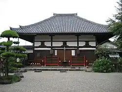 Pierwotnie kompleks składał się z centralnej pagody i trzech pawilonów kondō (na wschód, zachód i północ od pagody). Całość ma plan prostokąta obwiedzionego krużgankiem. Na północy, za krużgankiem, znajdował się jeszcze jeden pawilon. Brama wjazdowa umiejscowiona była na południu.