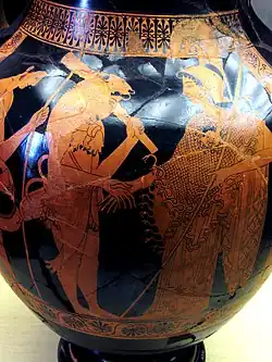 Pośrednim powodem konfliktu był ślub Peleusa i Tetydy. Na wesele nie zaproszono Eris, jako że była boginią niezgody. Ta pojawiła się jednak, rzucając jabłko z napisem „Najpiękniejszej”. Do tego tytułu uprawnione poczuły się Hera, Atena i Afrodyta. Zeus wybrał na sędziego porzuconego w dzieciństwie królewicza trojańskiego Parysa[38]. Hermes zaprowadził skłócone boginie przed Parysa mającego sądzić ich piękno[39]. Wszystkie trzy boginie rozebrały się przed młodzieńcem. Każda z nich próbowała skorumpować sędziego. Hera chciała dać mu władzę nad całą Azją. Atena obiecała chwałę wojenną. Afrodyta zaś zaproponowała Parysowi miłość najpiękniejszej kobiety świata. Królewicz wybrał tę ostatnią propozycję i przyznał jabłko Afrodycie, która pomogła mu również później porwać Helenę, żonę Menelaosa, ze Sparty. Obrażone Hera i Atena znienawidziły Parysa i przez całą wojnę pomagały Achajom przeciwko Trojanom[38].