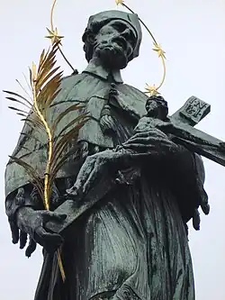 Św. Jan Nepomucen z krucyfiksem, z palmą, w komży i birecie