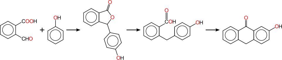 Inną klasą aromatycznych związków wielopierścieniowych uzyskanych przez grupę Bistrzyckiego były antrony, powstające w reakcji pochodnych ftalowych, np. kwasy ftaloaldehydowego i fenolu: