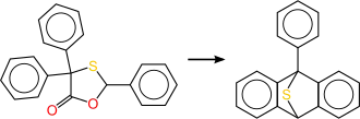 Interesujące rezultaty dały też prace nad kwasem tiobenzylowym, który w reakcji z aldehydami dawał pochodne 1,3-oksatiolanu. Np. produktem reakcji z benzaldehydem był 2,4,4-trifenylo-1,3-oksatiolan-5-on, który pod wpływem stężonego kwasu siarkowego dekarboksylacji i przegrupowaniu do 9-fenylo-9H-tioksantenu: