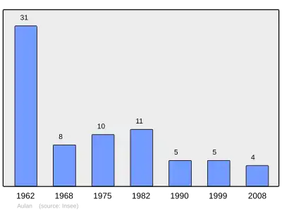 Według danych na rok 1999 gminę zamieszkiwało 5 osób, a gęstość zaludnienia wynosiła 1 osoba/km² (wśród 2880 gmin regionu Rodan-Alpy Aulan plasuje się na 1605. miejscu pod względem liczby ludności, natomiast pod względem powierzchni na miejscu 1078.).