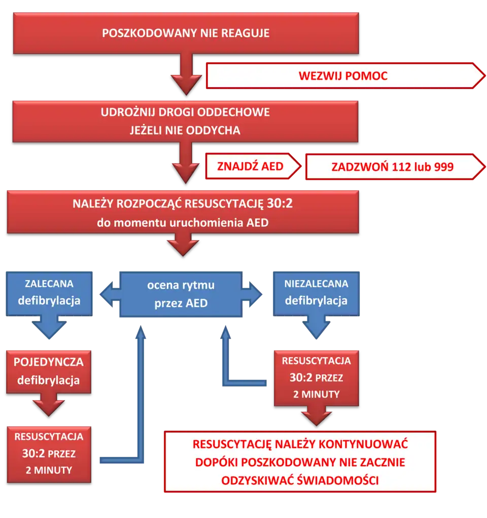 - Analiza rytmu serca poszkodowanego będzie powtarzana, a defibrylacja ponawiana w razie potrzeby, aż do przywrócenia normalnego rytmu pracy serca[5][6].