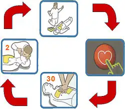 - Rozpocząć resuscytację w trybie 30:2 (30 uciśnięć klatki piersiowej na głębokość 5–6 cm i z częstotliwością 100–120[4] razy na minutę, następnie 2 wdechy ratownicze, w przypadku braku możliwości wykonania wdechów ratowniczych wystarczający jest ucisk klatki piersiowej).
