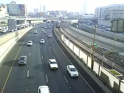 Autostrada jest bardzo mocno obciążona ruchem samochodowym (około 750 tys. samochodów dziennie). Pomiędzy jej wielojezdniowymi trasami biegnie linia kolejowa Rakewet Jisra’el z kilkoma stacjami.