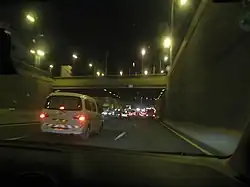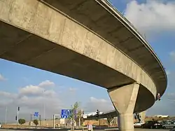 Po minięciu Ministerstwa Transportu, droga rozdziela się, umożliwiając minięcie kolejnych skrzyżowań tunelem Menahema Begina. Jadąc na powierzchni mija się duże skrzyżowanie przy Azrieli HaShalom Center. Po wyjechaniu z tunelu dojeżdża się do skrzyżowania z drogą nr 481. Następnie po prawej stronie mija się park Volovelski-Karni i dojeżdża się do dworca autobusowego Arlozorov. Po minięciu osiedla Bawli droga przejeżdża nad rzeką Jarkon i mija po prawej stronie Muzeum Izraela. Po przejechaniu przez osiedla Ramat Aviv i Ramat Aviv Gimel wyjeżdża się na przedmieścia Tel Awiwu. Mija się tutaj po lewej stronie zespół różnych uczelni, a po prawej stronie zakłady przemysłowe Pi Glilot.
