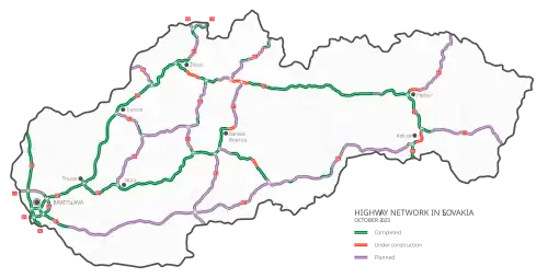 - ↑ Dane powstały przez dodanie wartości ze strony https://web.archive.org/web/20160614215704/http://www.ndsas.sk/rychlostne-cesty-r/44380s uwzględniając odcinki jedno jezdniowe jako wybudowane w całości