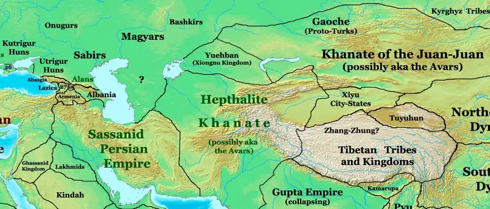 - Źródła chińskie podobnie jak Teofilakt mówią o schronieniu się odłamu Rouranów na obszarze północnych Chin. W relacji Teofilakta mówi się o mieście Tabgač, do którego uciekli War i Hunni. Nazwa Tabgač, wywodząca się od panujących w V i VI wieku w północnych Chinach Tabgaczy, była tureckim określeniem północnych Chin.
