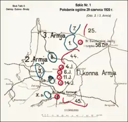 26 maja na Ukrainie wojska sowieckiego Frontu Południowo-Zachodniego przeszły do ofensywy, a już 5 czerwca trzy dywizje sowieckiej 1 Armii Konnej Siemiona Budionnego przełamały trwale polski front na odcinku obrony grupy gen. Jana Sawickiego[4][5].