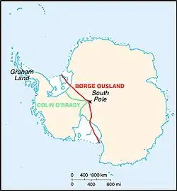 W 1995 Ousland przeszedł jako pierwszy Antarktydę od wybrzeża do wybrzeża, samotnie i bez wsparcia z zewnątrz, przechodząc przy tym przez biegun południowy. W wyniku odmrożeń musiał przerwać wędrówkę niedługo po przejściu bieguna północnego. Tym samym stał się pierwszym człowiekiem, który samotnie dotarł do obu biegunów, nie korzystając ze wsparcia z zewnątrz[4].