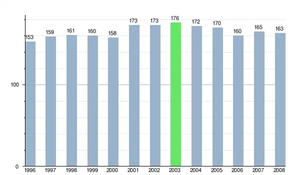 Zmiany liczby ludności w miejscowości Bžany od 1996 roku.