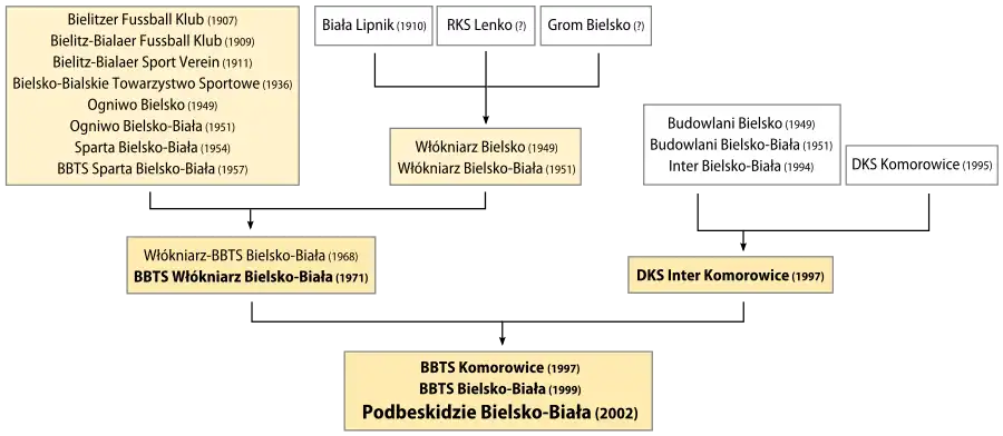 - W 1907 roku powstał w Bielsku, zamieszkanym wówczas głównie przez Niemców, najstarszy klub sportowy na Śląsku Cieszyńskim – Bielitzer Fussball Klub, który zmienił później nazwę na Bielitz-Bialaer Fussball Klub (przymiotnik Bialaer odnosił się do sąsiadującej z Bielskiem galicyjskiej Białej), a w 1911 roku – po utworzeniu dalszych sekcji – na Bielitz-Bialaer Sport Verein; w 1936 roku spolszczono nazwę na Bielsko-Bialskie Towarzystwo Sportowe. W 1928 roku BBSV było jednym z założycieli Polskiego Związku Piłki Nożnej[8]. W okresie międzywojennym drużyna piłkarska grała przeważnie w najwyższej klasie rozgrywkowej województwa śląskiego – Lidze śląskiej. Po II wojnie światowej BBTS występowało przeważnie na trzecim lub czwartym poziomie ligowym (w okresie likwidacji klubów sportowych i zastąpienia ich zrzeszeniami ogólnopaństwowymi, przyjęło nazwy Ogniwo i Sparta), w 1958 roku walcząc w barażach o awans do II ligi.