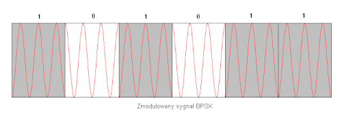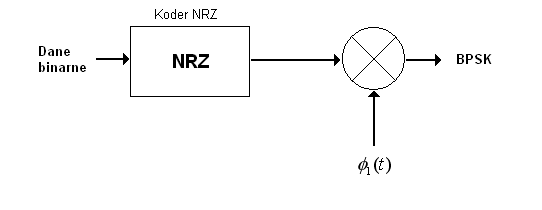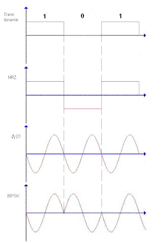 Dane binarne są poddawane bezpośredniemu kodowaniu NRZ – poziomom logicznym odpowiadają dwa napięcia o różnej polaryzacji ( i ). Przemnożenie otrzymanego sygnału z sygnałem nośnej daje na wyjściu modulatora pożądaną falę BPSK.