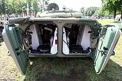 W przedniej części kadłuba znajdują się przedziały kierowania i napędowy z silnikiem UTD-20. W środkowej przedział bojowy z wieżą, a w tylnej przedział desantu.