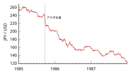 Recesja spowodowana silnym jenem nazywanym przez Japończyków endaka była ściśle związana z Porozumieniem Plaza z września 1985 roku[25].