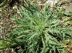 - Skrętoległe, skupione w przyziemną rozetę, bardzo zmienne pod względem kształtu i stopnia owłosienia[10], zwykle rozpostarte, czasem wzniesione, na starszych roślinach bardzo liczne[12]. Blaszka równowąska do lancetowatej[8] u nasady zwęża się w wąski ogonek, rzadko blaszka bywa całobrzega, zwykle jest ząbkowana do pierzastosiecznej, przy czym ząbki i łatki liścia bywają delikatne lub bardzo wydatne, równowąskie do jajowatych, nierzadko łatki są także ząbkowane do siecznych – zdarzają się rośliny o liściach w efekcie podwójnie pierzastosiecznych. Blaszki bywają cienkie do gruboszowatych, przy czym te mięsiste są zwykle też bardziej jasnozielone[10]. Osiągają zwykle do 8 cm długości i 1,5 cm szerokości[11], maksymalnie jednak do 30 cm długości i 5,5 cm szerokości[10].
