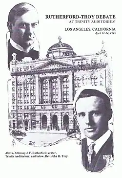 Przez następne 12 lat począwszy od roku 1903 współpracownicy Russella przyjmowali podobne wyzwania, choć ich przeciwnicy religijni często rezygnowali lub się wycofywali[n]. W kwietniu 1915 roku J.F. Rutherford przyjął wyzwanie baptystów reprezentowanych przez Johna H. Troya[50]. Dyskusja ta odbyła się w dniach od 21 do 24 kwietnia 1915 roku w Trinity Auditorium w Los Angeles na oczach 12 tysięcy widzów, przy czym dla około 10 tysięcy osób zabrakło miejsc.