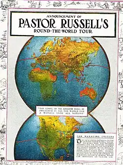 W okresie od grudnia 1911 roku do marca 1912 siedmioosobowy komitet z Russellem na czele odbył podróż dookoła świata[i]. Podróż rozpoczęła się w Nowym Jorku, dalej poruszając w kierunku zachodnim poprzez Chicago, Dallas, San Antonio i Los Angeles dotarto do San Francisco. Dalsza podróż odbyła się statkiem poprzez Hawaje, Japonię, Chiny, południową Azję, Afrykę i Europę, skąd nastąpił powrót do Nowego Jorku. Celem tej podróży było rozpoznanie możliwości rozszerzenia działalności na inne kraje. W sprawozdaniu z tej podróży komitet uznał za potrzebne tłumaczenie literatury biblijnej na języki: japoński, chiński, hindi, gudżarati, malajalam, marathi, telugu i tamilski[41].