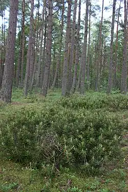 Roślina występuje na terenach podmokłych, zacienionych i zakwaszonych (mokre lasy sosnowe, torfowiska wysokie, bory bagienne). Rośnie razem z modrzewnicą, wrzosem, żurawiną i wrzoścem bagiennym[14]. W klasyfikacji zbiorowisk roślinnych gatunek charakterystyczny dla Ass. Vaccinio-uliginosi-Pinetum i gatunek wyróżniający dla Ass. Ledo-Spaghetum[15].