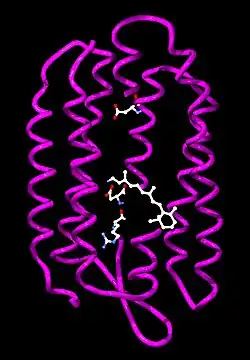- ↑ Lanyi JK., Lanyi JK. Pathways of proton transfer in the light-driven pump bacteriorhodopsin. „Experientia”. 6-7 (49), s. 514–7, lipiec 1993. PMID: 11536537.
