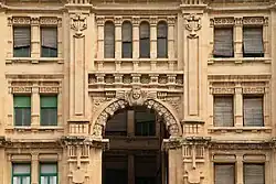 Bloki na niższych piętrach połączone są werandami, z gładką fasadą na górnych kondygnacjach. Konstrukcja, która zawiera wiele sklepów, wzmacnia cały budynek na poziomie ulicy, potęgując jego trójwymiarowość[2]. Budynek powstał z lokalnego wapienia[3].