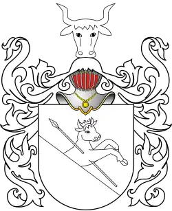 Bandemer IIIa: Pole dwudzielne w skos lewy; w górnym srebrnym pół bawołu czerwonego wspiętego, z gwiazdą złotą pomiędzy rogami, trzymającego włócznię pomiędzy przednimi nogami; pole dolne szachowane błękitno-srebrnie.