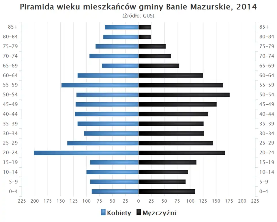 - Piramida wieku mieszkańców gminy Banie Mazurskie w 2014 roku[1].