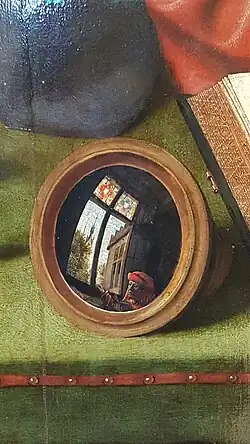 W wypukłym lustrze na pierwszym planie zostało ukazane odbicie twarzy czytającego człowieka, który nie znajduje się na obrazie. Gustav Hartlaub przypuszcza, iż może być to autor obrazu[2]. Georges Marlier natomiast uważa, iż postać ta oznacza życie kontemplacyjne, dzięki któremu ludzie są w stanie postępować moralnie.