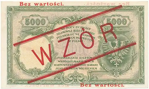 Pod koniec drugiego dziesięciolecia XXI w. banknot o nominale 5000 złotych znany jest tylko w postaci wzorów, tzn. egzemplarzy z dodatkowymi czerwonymi nadrukami: