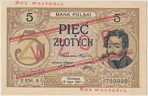 Z datą 15 lipca 1924 r. wydrukowano banknoty drugiej emisji o nominałach: 5, 10 i 20 złotych, wprowadzone do obiegu od 30 września 1924 r[14]. Było to spowodowane brakiem najniższych nominałów w kasach banku[15]. Wzory banknotów praktycznie nie różniły się od swoich odpowiedników z emisji z 28 lutego 1919 r., choć dokonano drobnych zmian takich jak np. korekta tekstu klauzuli prawnej. Produkcja banknotów została przeniesiona do Polski, do drukarni Banku Polskiego w Warszawie[5], w której wykorzystano oryginalne francuskie klisze[15].