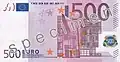 - przy prawej krawędzi awersu banknotów 500 € nadrukowane są skośne linie.