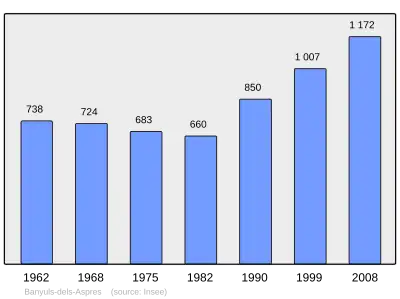 Według danych na rok 1990 gminę zamieszkiwało 850 osób, a gęstość zaludnienia wynosiła 81 osób/km² (wśród 1545 gmin Langwedocji-Roussillon Banyuls-dels-Aspres plasuje się na 385. miejscu pod względem liczby ludności, natomiast pod względem powierzchni na miejscu 727.).