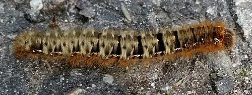 Gąsienica charakteryzuje się silnym owłosieniem, którego brak jednak na łączeniach segmentów. Ubarwienie ma szarożółte z białymi paskami podłużnymi na bokach ciała oraz czarnymi paskami poprzecznymi na łączeniach segmentów, zaopatrzonymi w dwie białe kropki każdy[1].