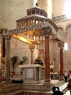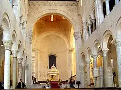 - Romańska bazylika św. Mikołaja (San Nicola), której budowę rozpoczęto dwa lata po przywiezieniu przez Normanów w 1087 roku relikwii św. Mikołaja[3]. Jest to potężna budowla romańska o charakterystycznej surowej formie, z tronem biskupa Eliasza (XI wiek) i XII-wiecznym cyborium. W bazylice złożono relikwie św. Mikołaja przywiezione z Azji Mniejszej do Bari; w X wieku św. Mikołaj otoczony był ogromnym kultem, zyskał miano świętego patrona miasta. O kulcie patrona świątyni przypominają znajdujące się w środku dzieła sztuki. Obecnie kustoszami bazyliki są dominikanie. W 1984 w bazylice modlił się Jan Paweł II.