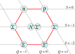 - Diagramy obrazujące ładunek i dziwność niektórych barionów